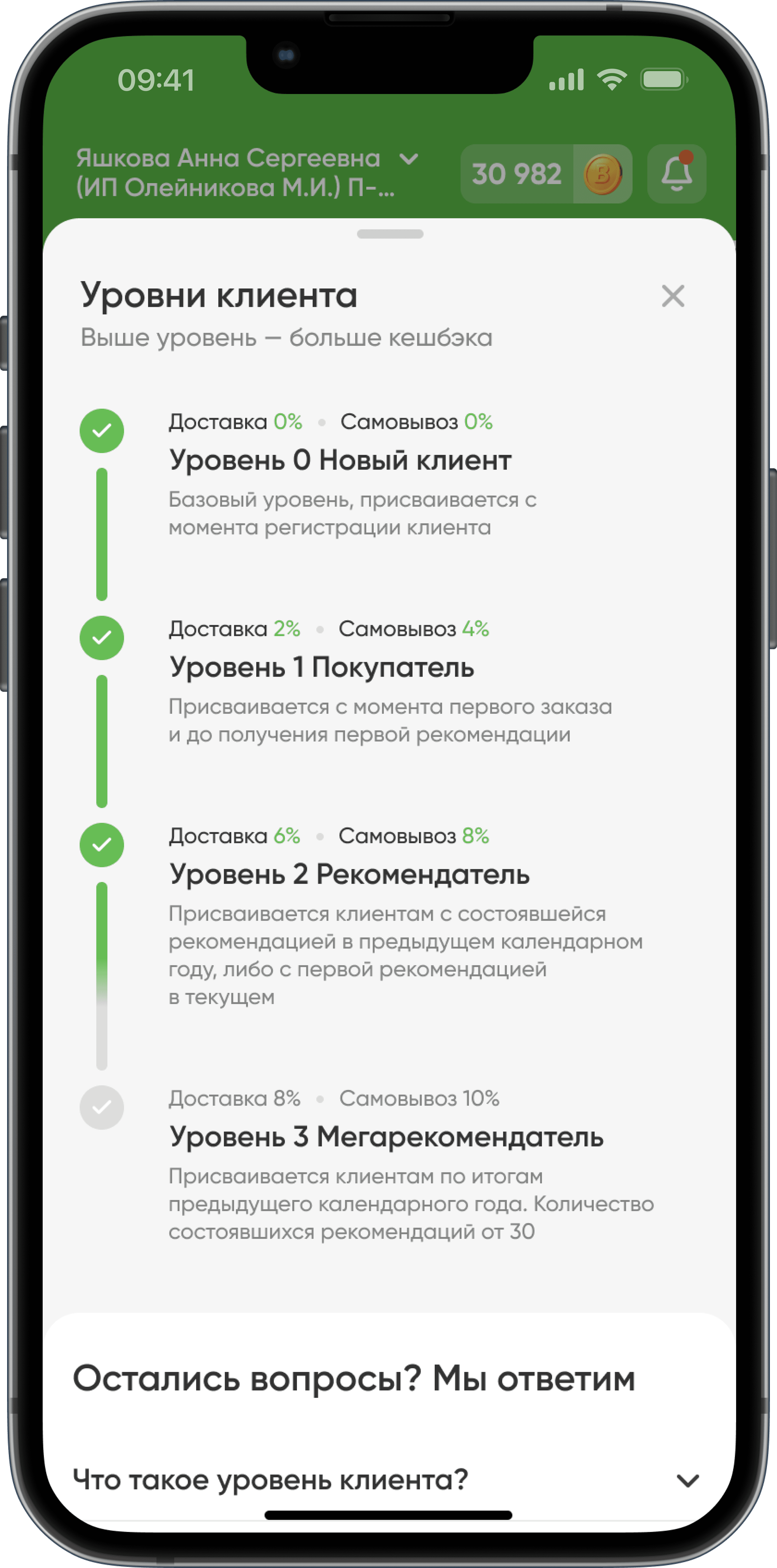 – Вынести уровни клиента и карту клиента на главный экран, чтобы курьер и сотрудники магазина могли быстро идентифицировать договор для начисления кешбэка баллами