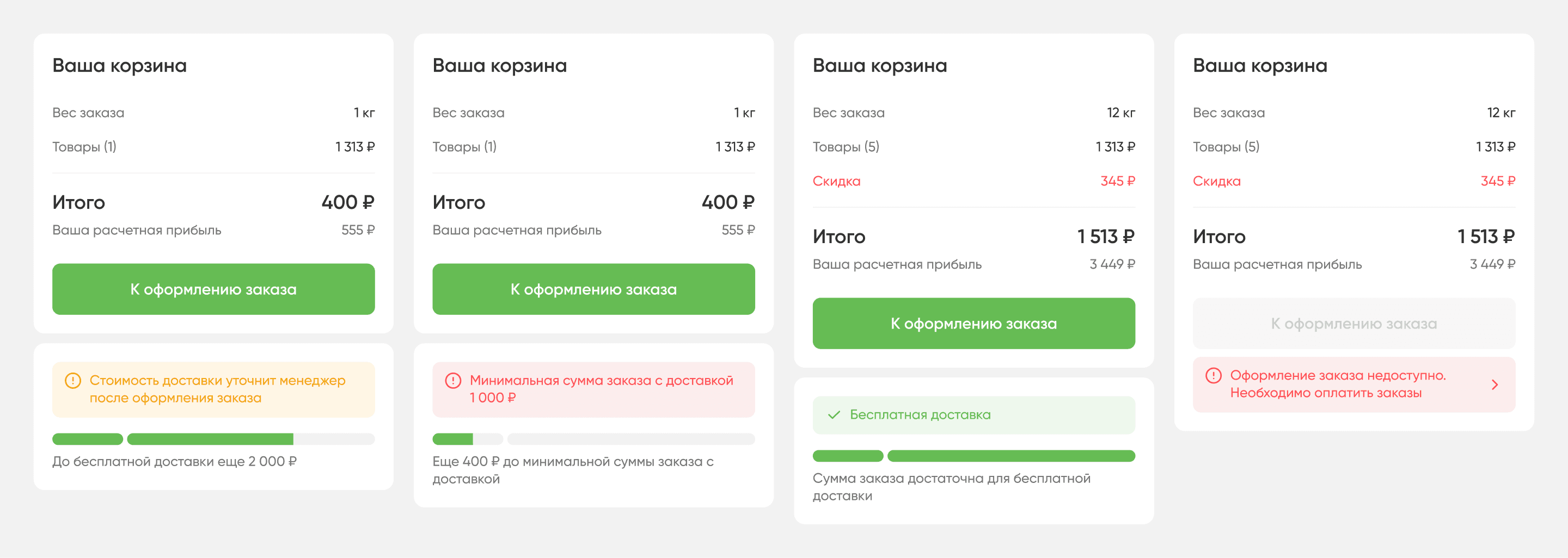 – Стоимость доставки рассчитывает менеджер после согласования заказа, если по условиям договора клиент не достиг порога для бесплатной доставки, это тоже нужно было донести до пользователей