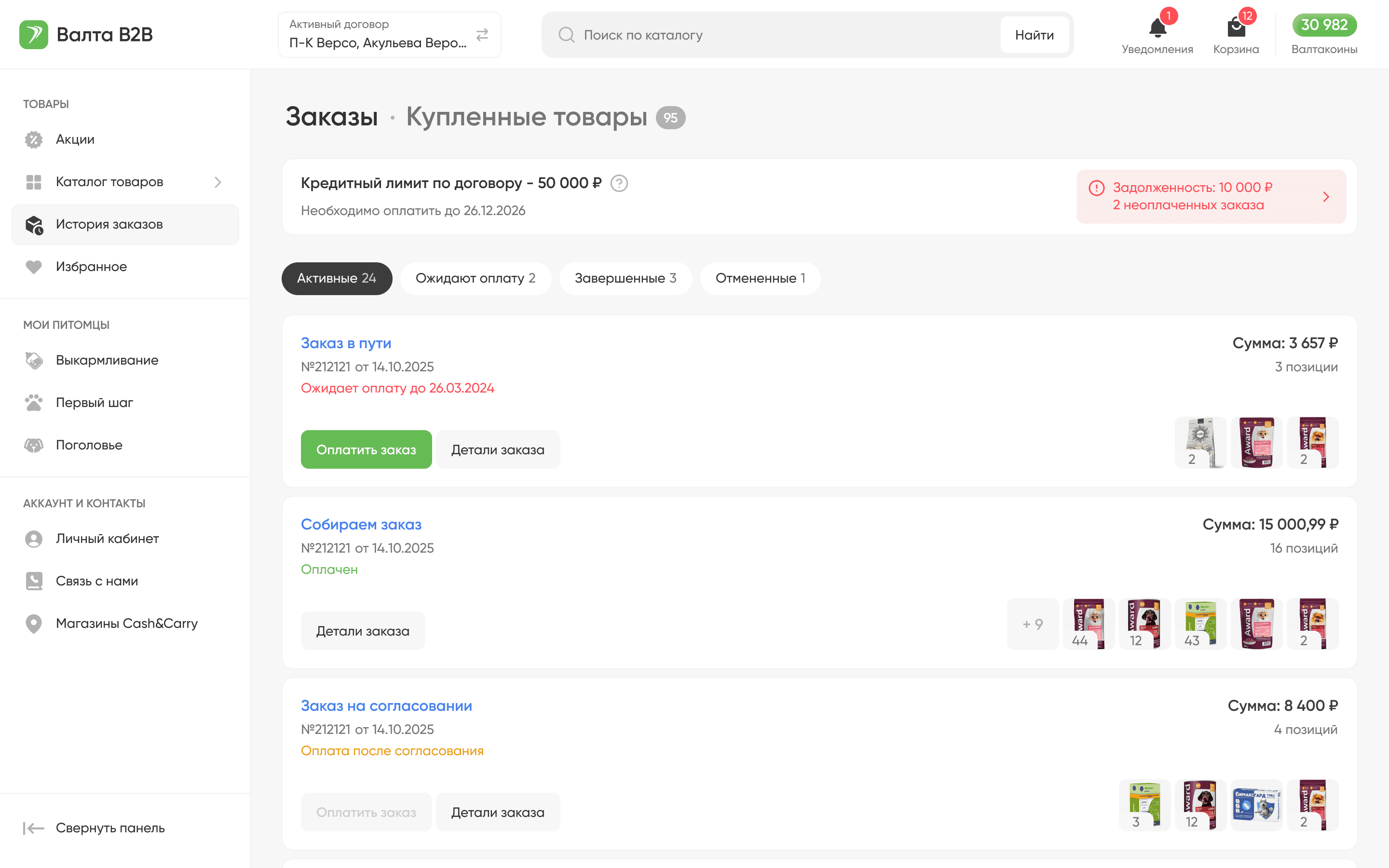 – В истории заказов отображается общая задолженность по договору, чтобы клиент видел суммарный долг перед компанией, а не искал и оплачивал его по каждому заказу отдельно