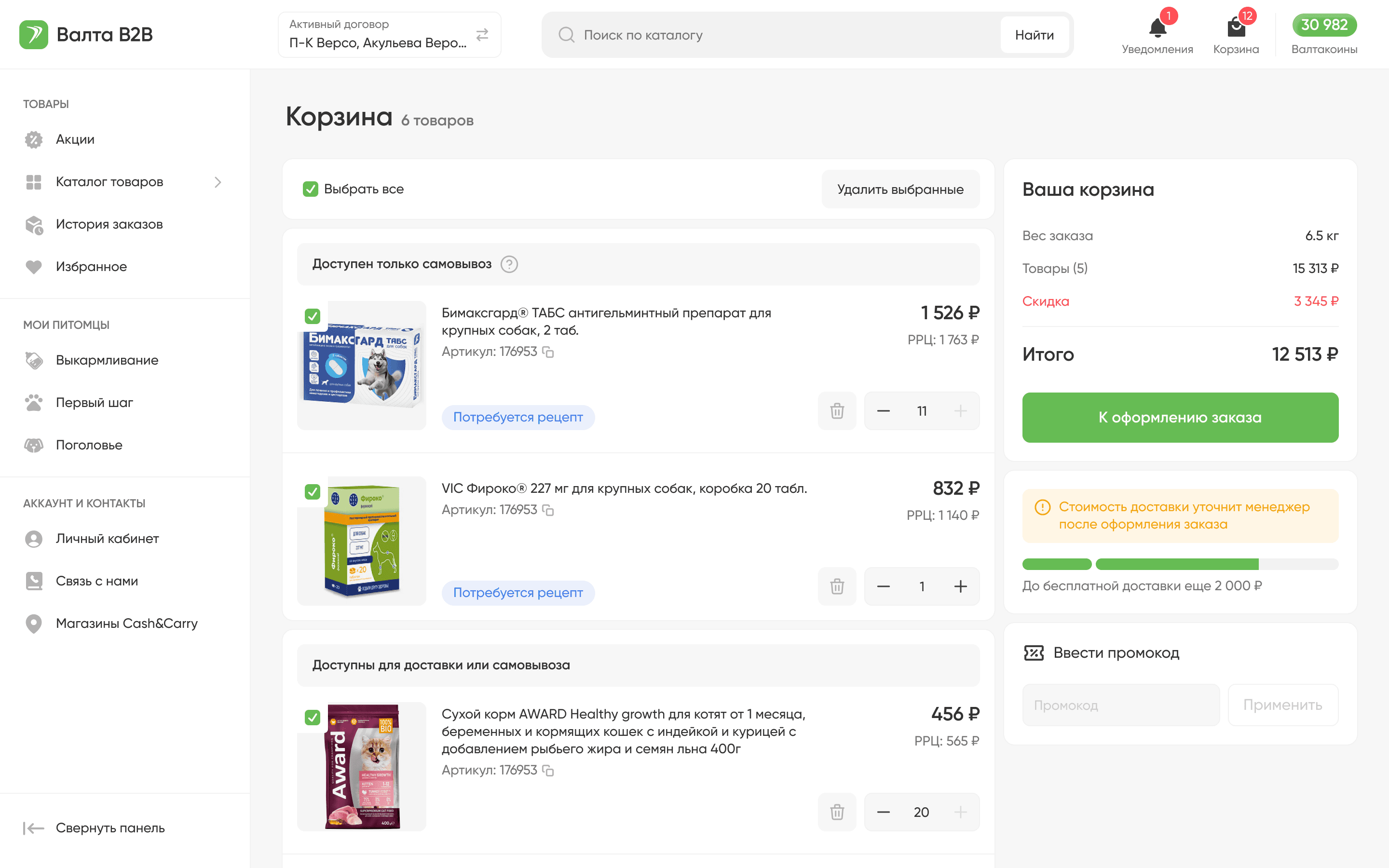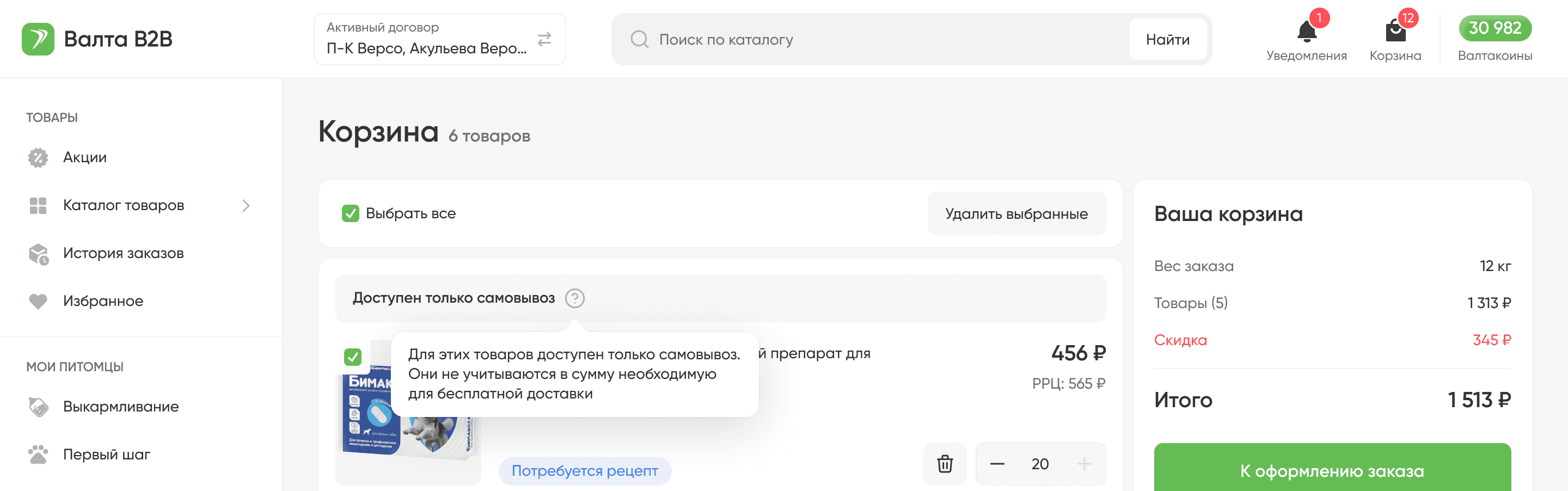 – У юрлиц была довольно простая корзина: они могут заказывать рецептурные товары, потому что у них есть договор на поставки. У физлиц такие позиции доступны только при самовывозе, поэтому для них появился дополнительный флоу, когда в корзине одновременно есть товары с доставкой и товары «только самовывоз», которые переносятся вверх списка корзины в отдельный блок и не учитываются в общую сумму до бесплатной доставки