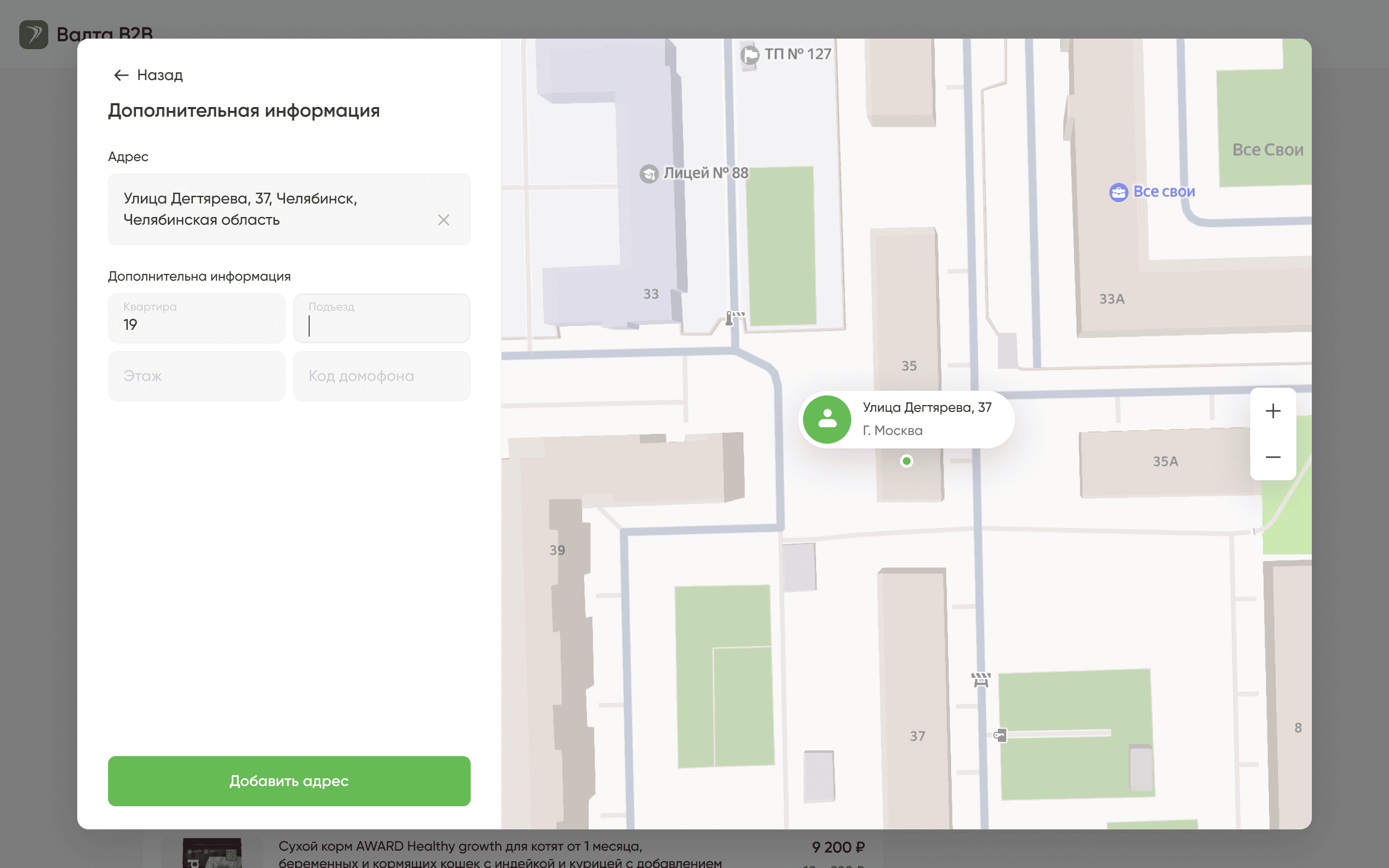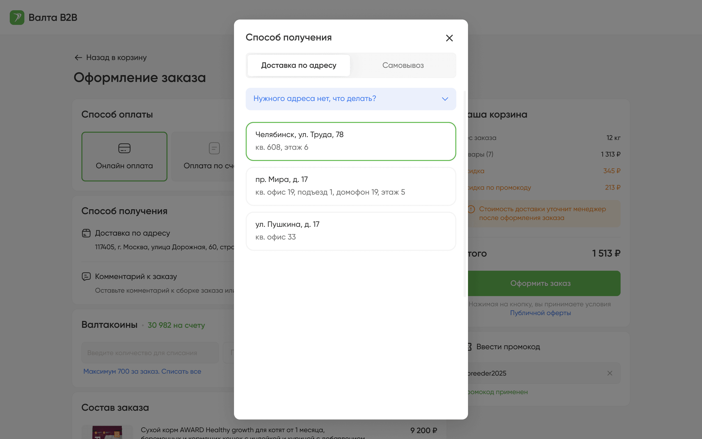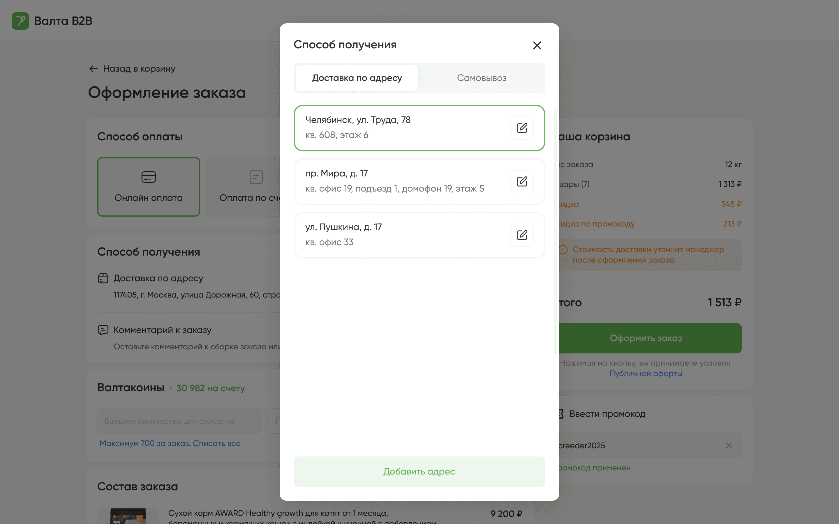 – Разделился флоу по типам договора: физлица могут добавлять и редактировать адреса доставки, а юрлица выбирают только из адресов, уже прописанных в их договоре.