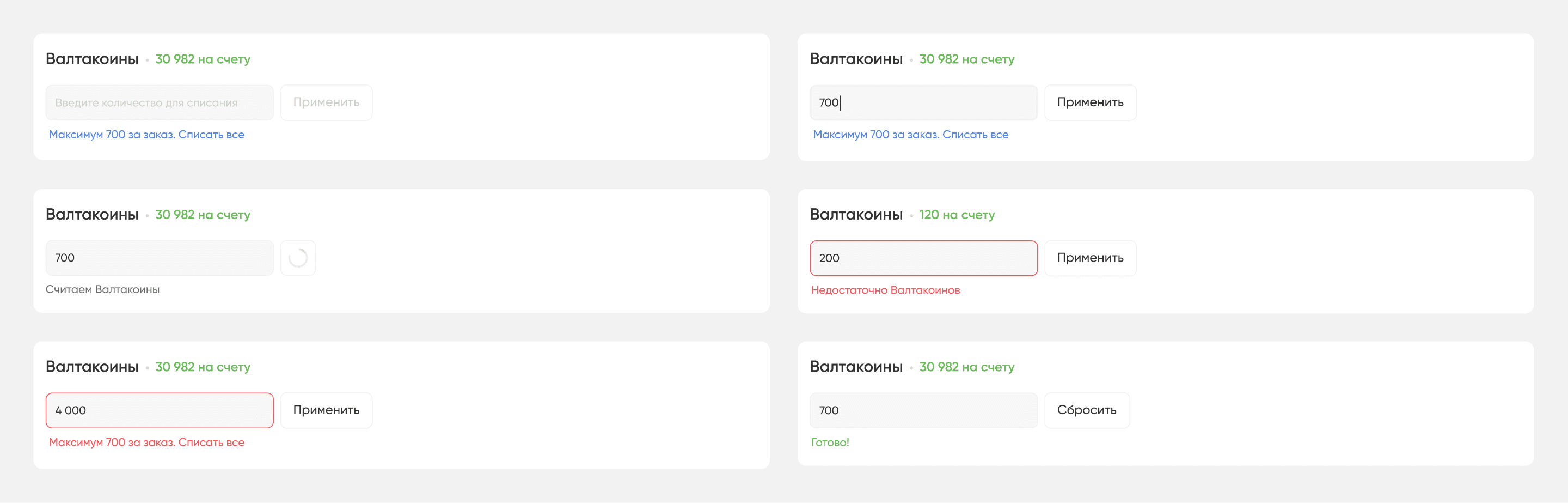 Состояния блока баллов. Мы заметили, что часто пользователи списывают либо круглую сумму баллов, либо столько сколько возможно списать за заказ, по этому добавили кнопку «Списать все»