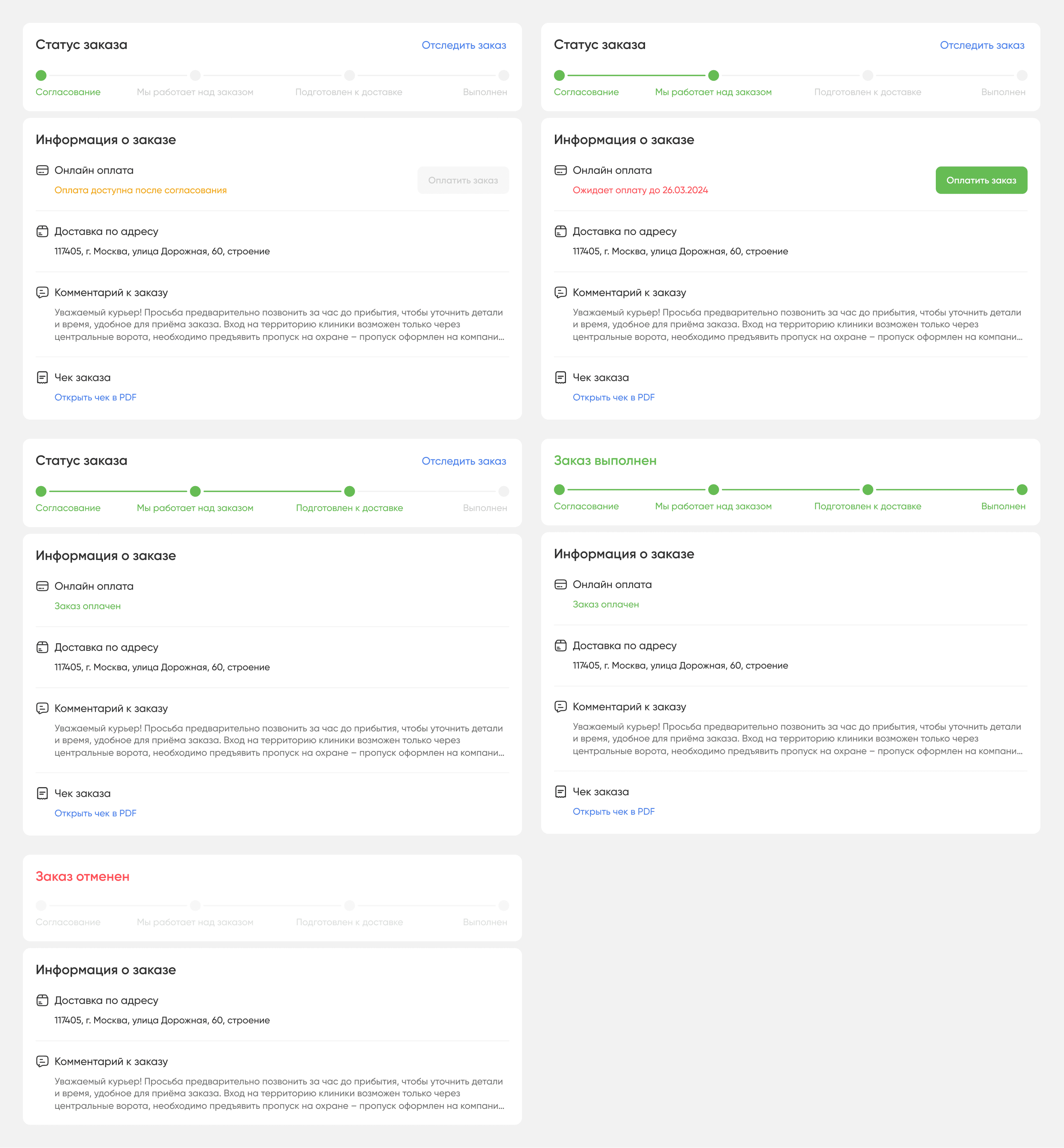 – В истории заказов появилась наглядная шкала отслеживания: вместо десятков внутренних статусов из 1С вроде «На контроле» или «Частично отгружен на склад» клиент видит несколько понятных этапов и быстро считывает, что сейчас происходит с заказом. Для тех, кому нужно более детальное отслеживание логистики, есть интеграция с трекером доставки